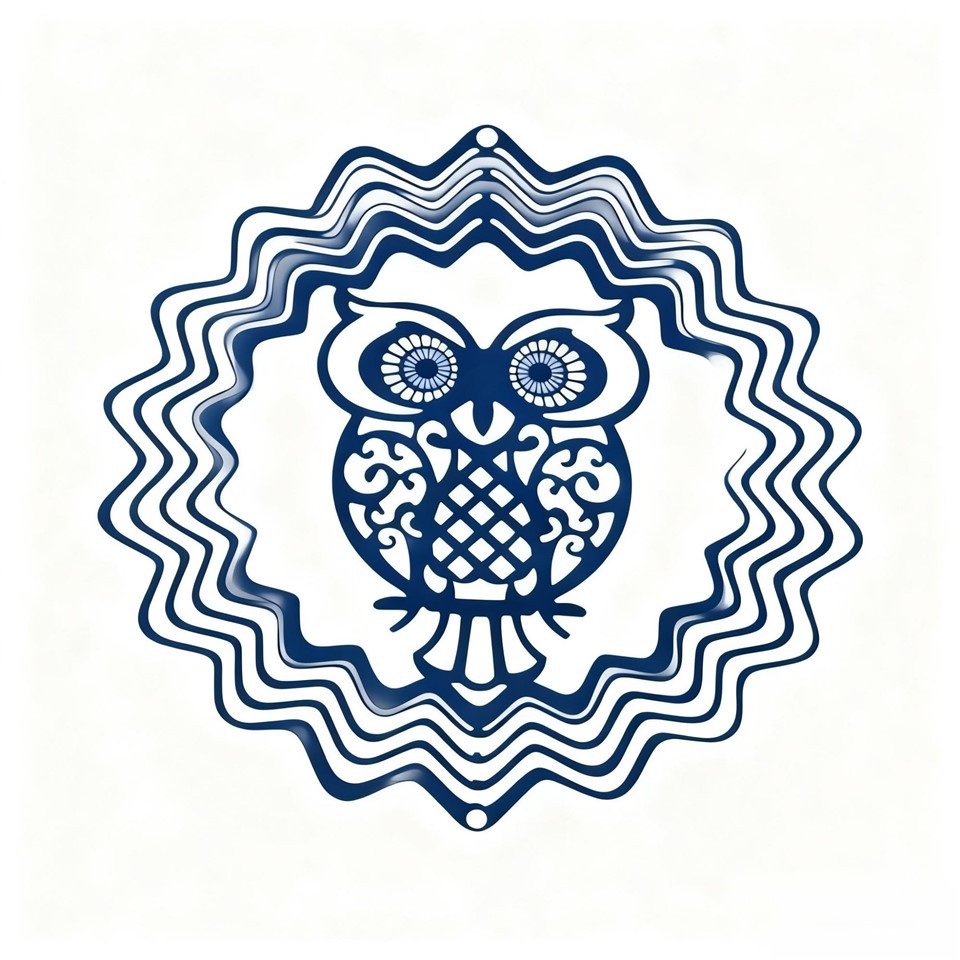 Tämä on metallinen tuulipyöriipus pöllökuviolla. Pöllömuoto on hieno, koristeltu kuvioin ja sitä ympäröi aaltomainen monikerroksinen pyöreä rakenne. Tämän tuulipyörän voi yleensä ripustaa sisäpihoille, parvekkeille ja muihin paikkoihin, ja se pyörii tuulen puhaltaessa, mikä lisää koristelua ja hauskanpitoa. Sitä voidaan käyttää myös sisäovien ja ikkunoiden koristeriipuksena.